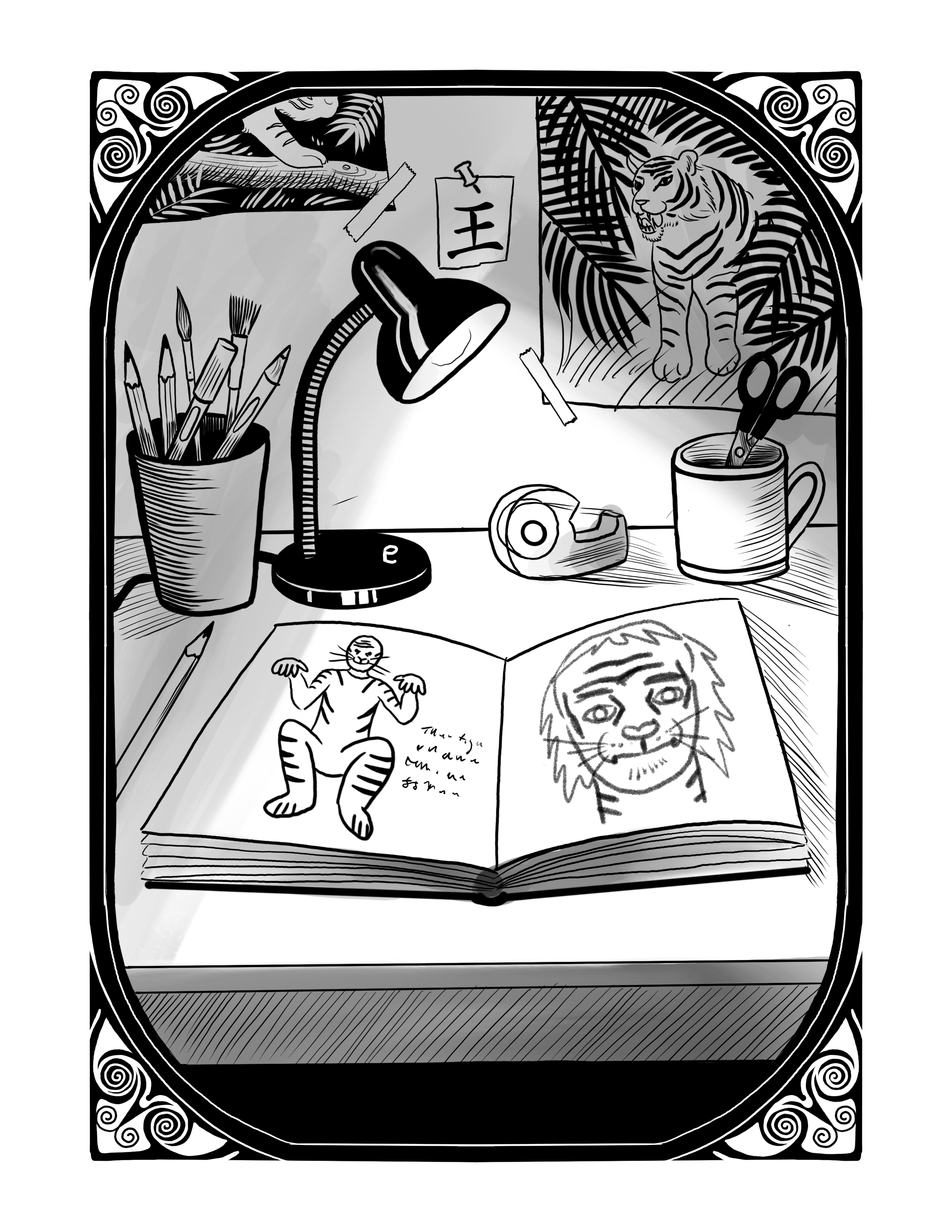 The world must see, he thought. The obvious choice was a tiger’s face tattooed over his own. He filled the rest of his journal with designs and fantasies for this transformation. In these sketches he saw a fulfilling lifestyle, he saw his true identity. His uncle, his priest, the librarian, several dog-walkers at the park, and the tattoo artist herself cautioned him against the idea, but he insisted it was his destiny.